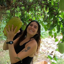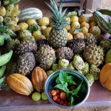 Often we have papaya, plantains, jackfruit, canistel, mamey sapote, rough lemons, naranjilla, hot peppers, salak, and noni. Seasonally you may enjoy biriba/rollinia, peach-palm, abiu, mangosteen, starapple, oranges, guava, iñaco, peanut butter fruit, mandarins, starfruit, marang, ice cream bean, apai, queen palm, and cacao. Sometimes soursop, pineapple, miracle berry, cherry tomato, squash, jaboticaba, breadfruit, bacao, cempedak, and matoa.