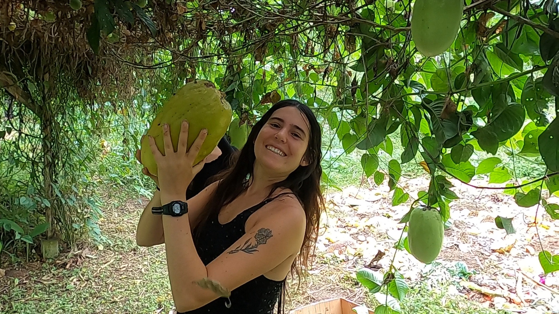 Often we have papaya, plantains, jackfruit, canistel, mamey sapote, rough lemons, naranjilla, hot peppers, salak, and noni. Seasonally you may enjoy biriba/rollinia, peach-palm, abiu, mangosteen, starapple, oranges, guava, iñaco, peanut butter fruit, mandarins, starfruit, marang, ice cream bean, apai, queen palm, and cacao. Sometimes soursop, pineapple, miracle berry, cherry tomato, squash, jaboticaba, breadfruit, bacao, cempedak, and matoa.